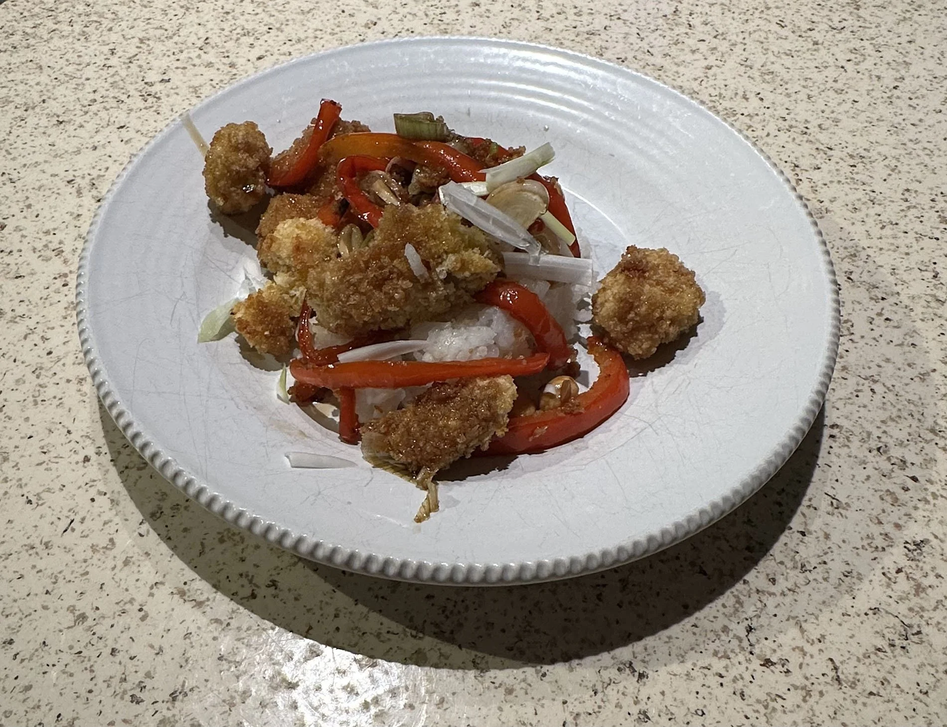 Remove the baking sheet from the oven. Pour the sauce over the chicken and pepper mix and toss to coat. To serve, divide the steamed rice among bowls and add the chicken and peppers. Top with thinly sliced green onions.